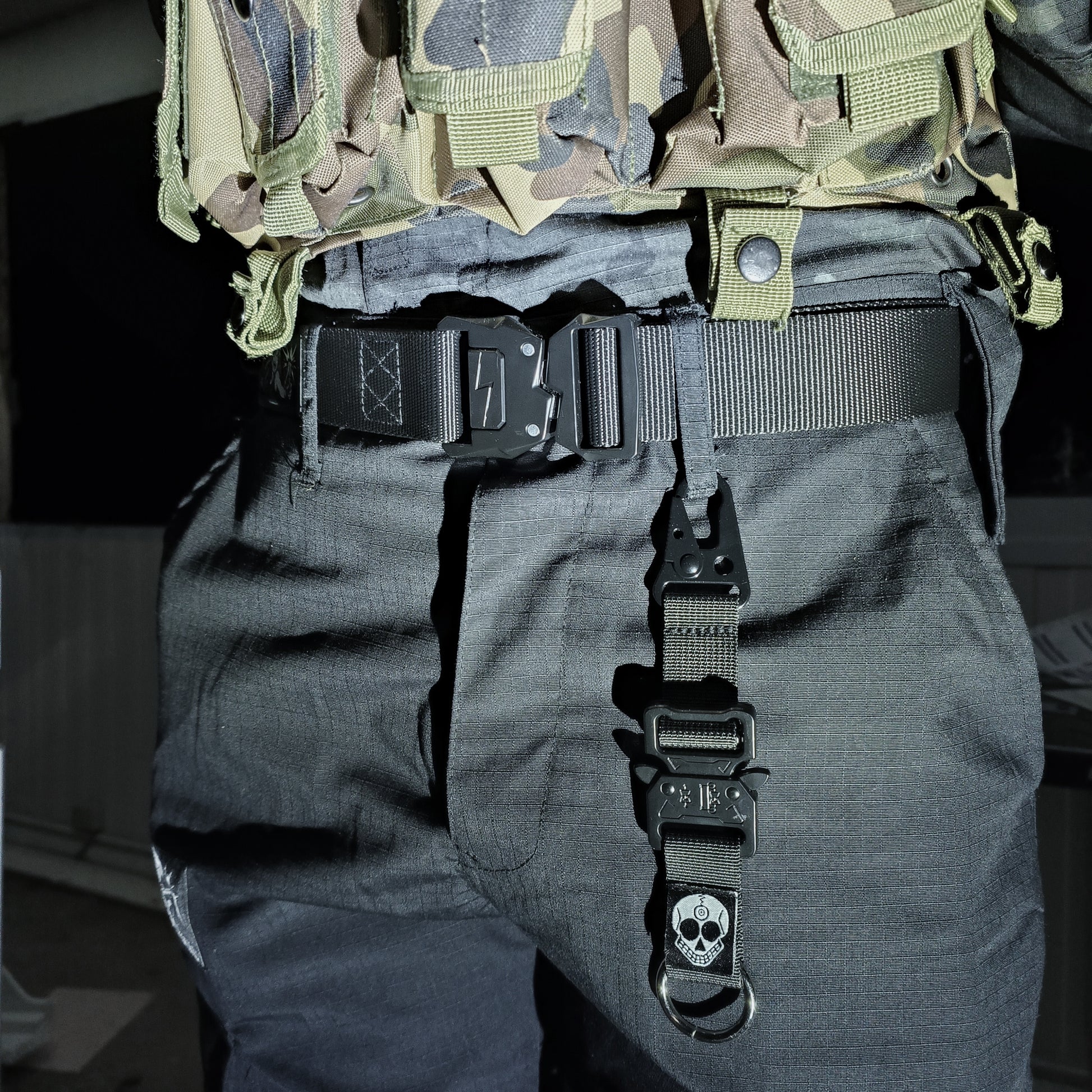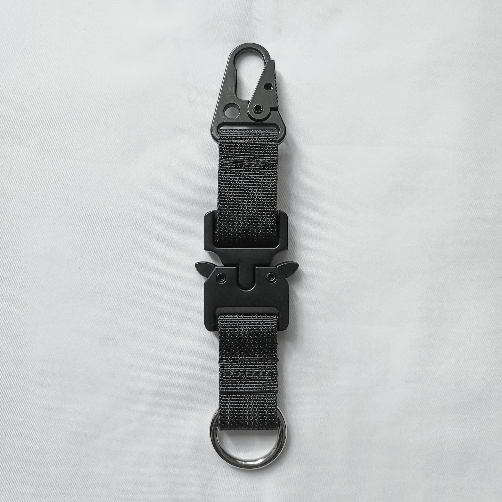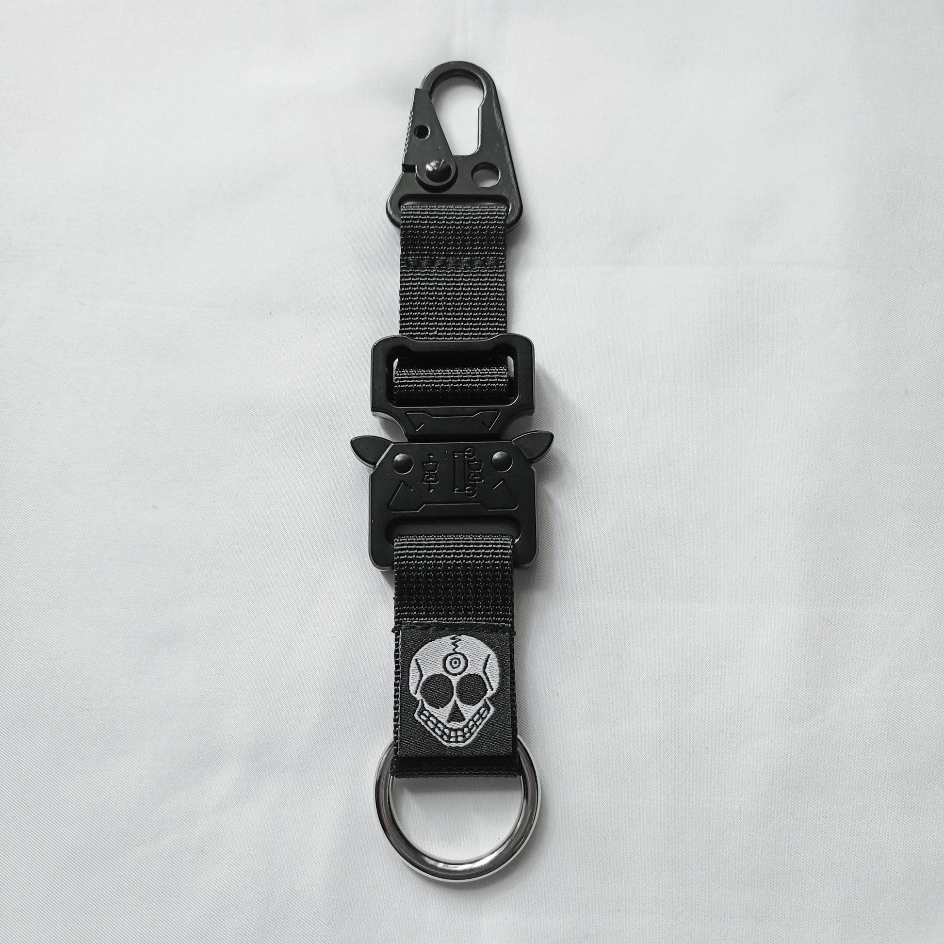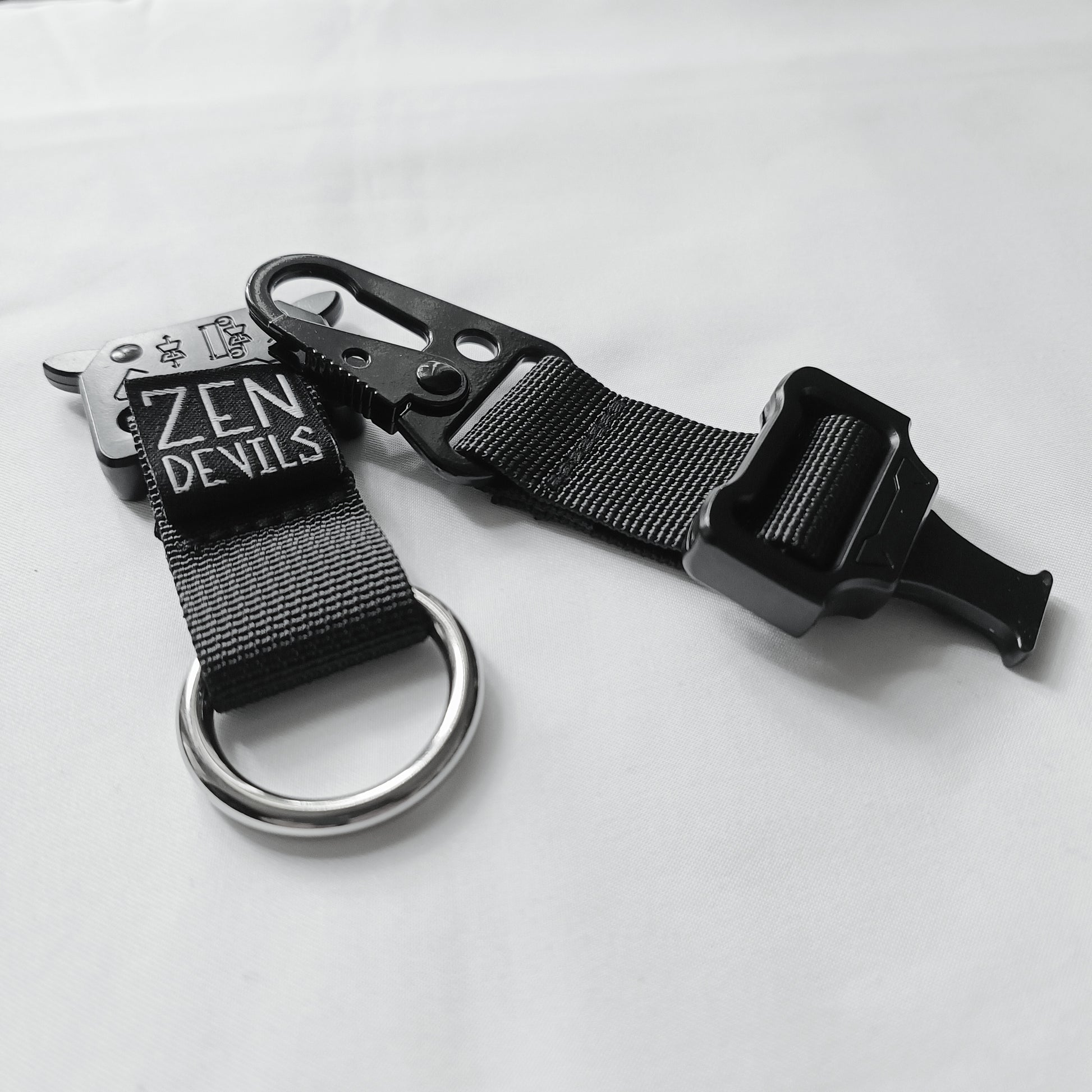 This keychain features a carabiner clip on one end and a ring on the other. The middle includes a quick-release mechanism that splits the item in two. You can attach the carabiner clip to almost anything, while the ring is ideal for key rings. This sturdy keychain is heavier due to its all-metal construction, including the carabiner clip, quick-release mechanism, and ring. It features the woven Zen Devils skull logo.